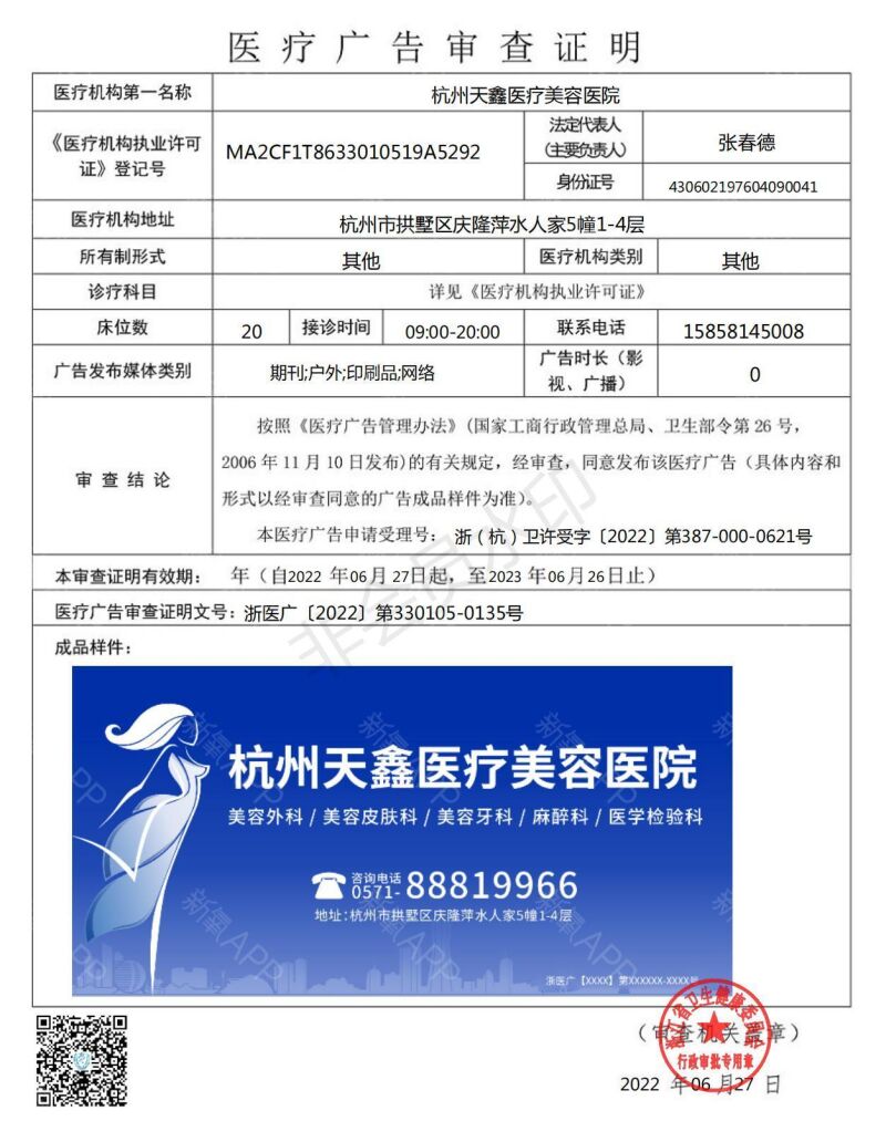 机构名称:杭州天鑫医疗美容医院